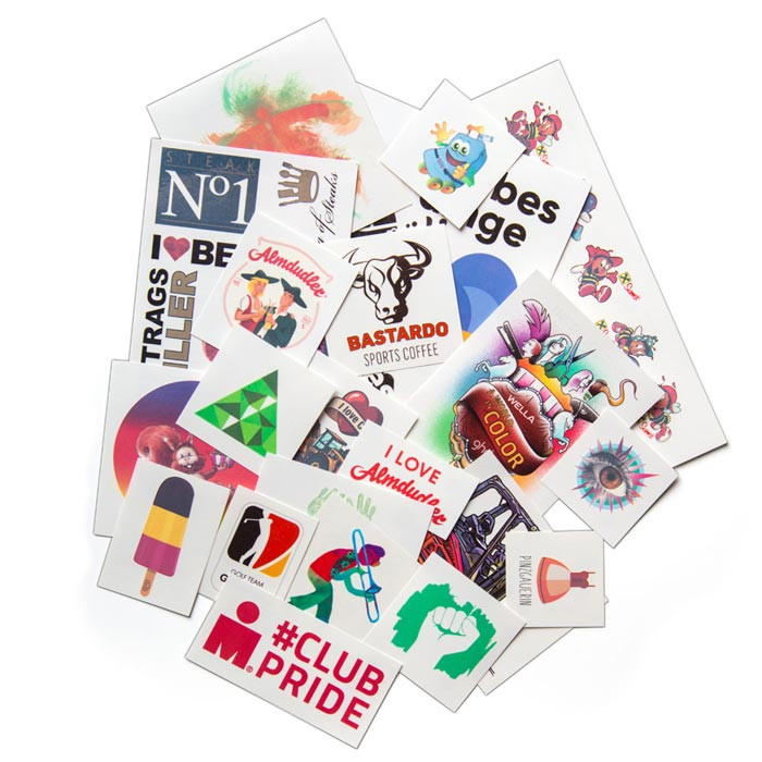 Egal ob unverwechselbares Fotomotiv oder modisches Schmuckornament – wir setzen Ihre individuellen Wünsche als temporäres Tattoo um. Individuelle, einfarbige oder mehrfärbige Motive, inklusive Rückendruck in schwarz. Geprüfte Herstellung nach EU Kosmetikverordnung Nr. 1223 /2009, hautfreundlich und reizfrei.