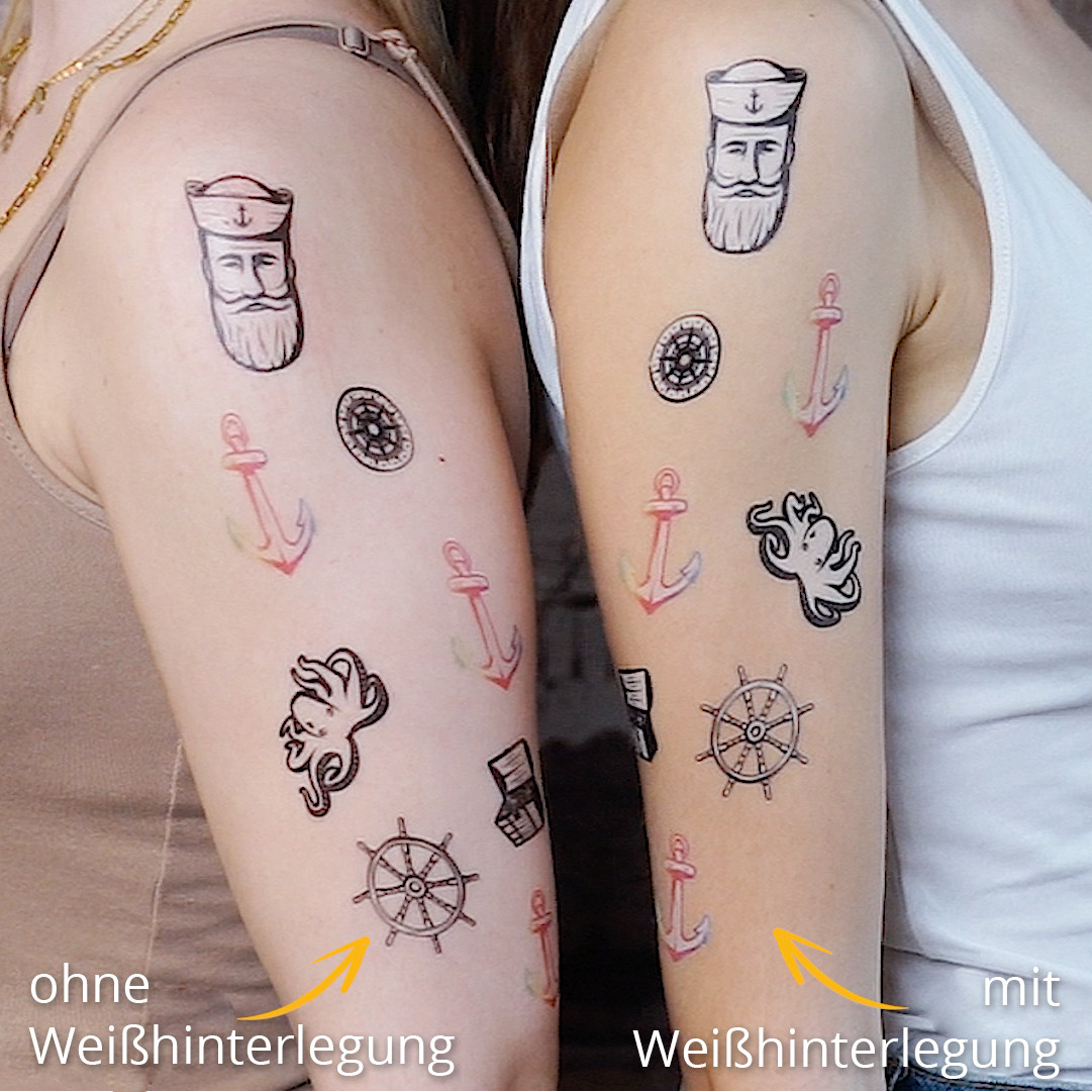 HINWEIS: Sobald Sie die Druckfarbe "weiß" im Druck inkludiert haben, muss der Tattoo Sticker klein mit Weißhinterlegung gewählt werden.